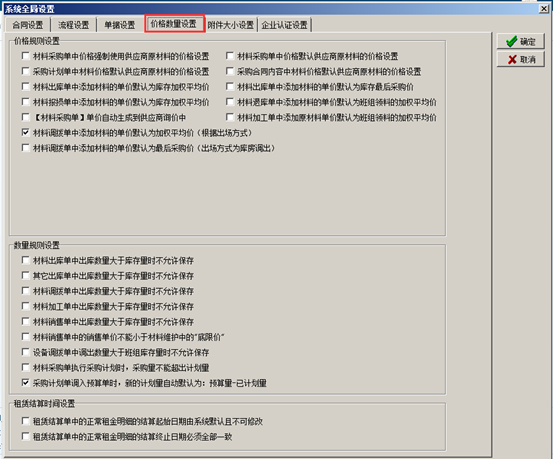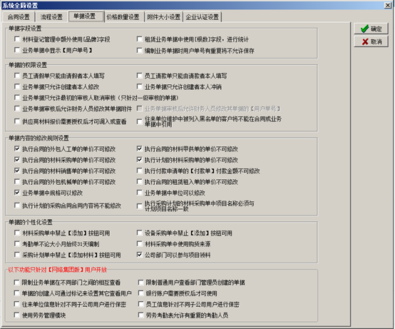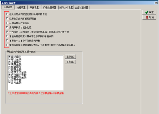 進入系統(tǒng)的“系統(tǒng)維護”-“系統(tǒng)全局設置”彈出系統(tǒng)全局設置的對話框,點擊“合同設置”,在對應的復選框打鉤代表合同受對應開關的控制,如圖: