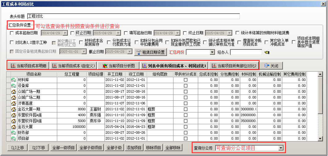 查看項(xiàng)目與項(xiàng)目之間的成本利潤對比,輸入查詢條件,點(diǎn)擊“列表中所有項(xiàng)目成本利潤對比1”,如圖