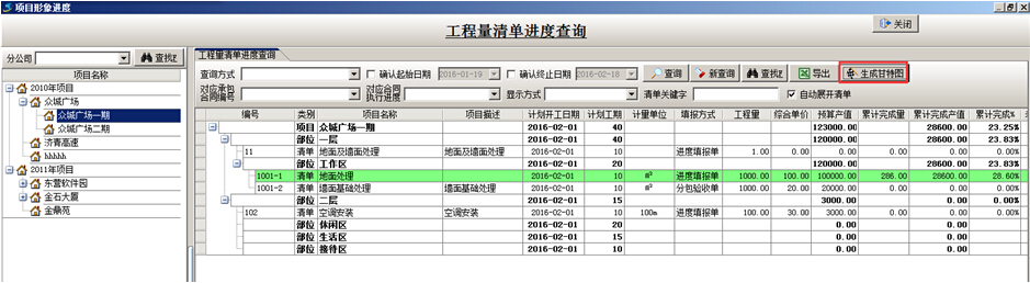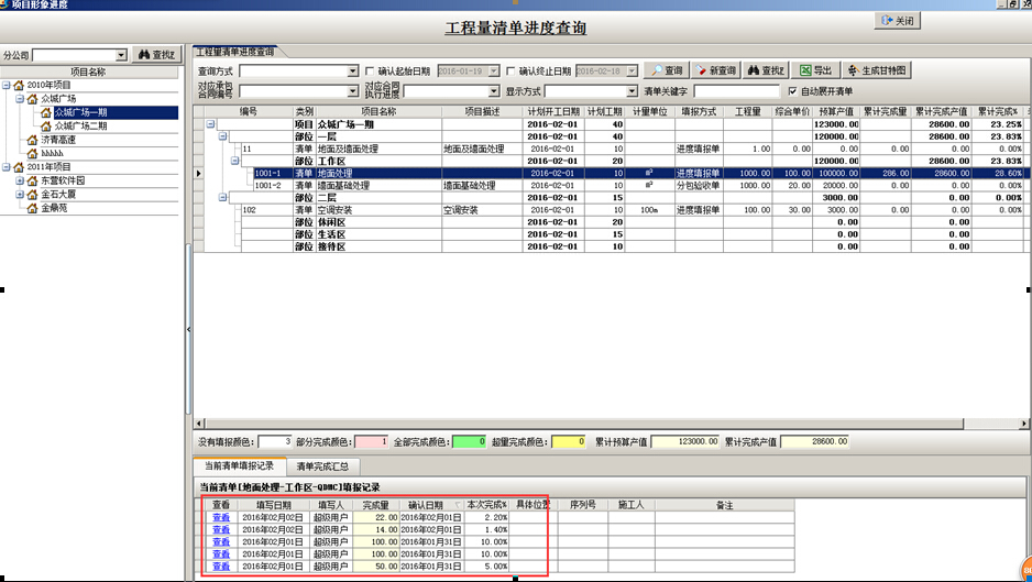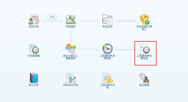 工程項(xiàng)目管理系統(tǒng)中進(jìn)行項(xiàng)目進(jìn)度查詢(xún)時(shí),系統(tǒng)會(huì)根據(jù)項(xiàng)目部分以及工程量清單匯總項(xiàng)目進(jìn)度。如圖: