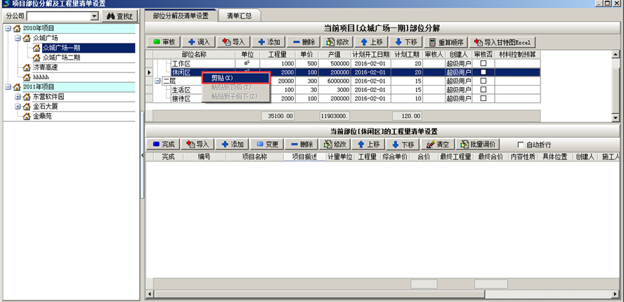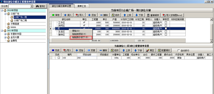 工程項(xiàng)目管理系統(tǒng)中已維護(hù)好的項(xiàng)目部位可進(jìn)行剪切粘貼的操作?!凹羟小睍r(shí)選中要變動(dòng)的部位,點(diǎn)擊鼠標(biāo)右鍵選擇“剪切”,“粘貼”時(shí)選中項(xiàng)目部位,點(diǎn)擊鼠標(biāo)右鍵,選擇“粘貼到頂級(jí)下”或“粘貼到子級(jí)下”,如圖: