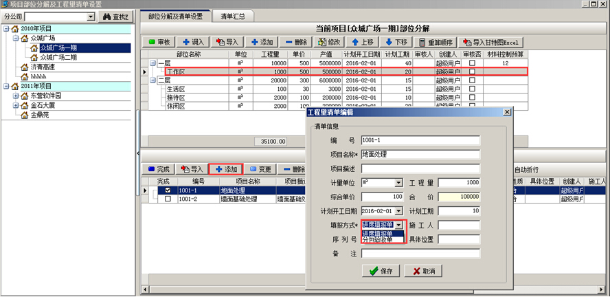 工程項(xiàng)目管理系統(tǒng)中部位分解完成之后,對(duì)項(xiàng)目做工程量清單設(shè)置。首先選中項(xiàng)目部位,然后在“工程量清單”里面點(diǎn)擊“添加”添加工程量清單,在編輯工程量清單時(shí),填寫(xiě)各項(xiàng)基本信息。如圖: