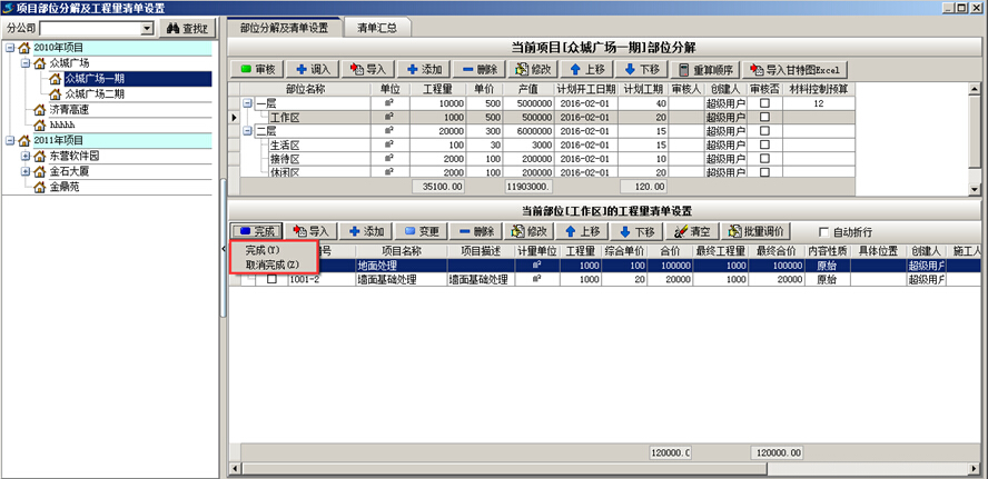 (2)由于某種原因工程不再繼續(xù)進(jìn)行,但是完成的工作量小于設(shè)置的工程量,此時(shí)需要在【部位分解工程量清單設(shè)置】中手動(dòng)設(shè)置清單為“完成”狀態(tài)。如圖:
