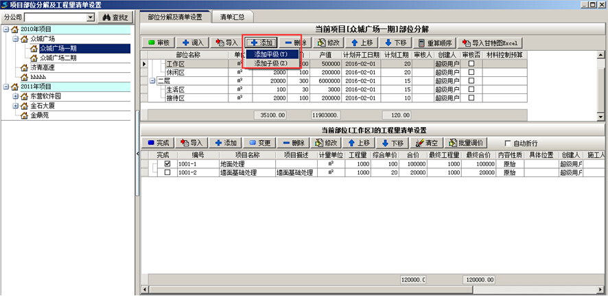 在《金石工程項(xiàng)目管理系統(tǒng)》中,進(jìn)行項(xiàng)目部位分解時(shí),可按照層次或級(jí)別進(jìn)行分解,即添加“平級(jí)”或“子級(jí)”。