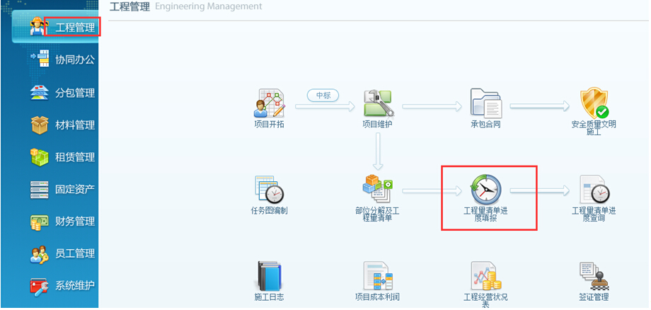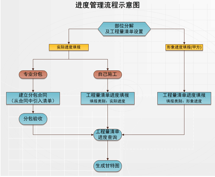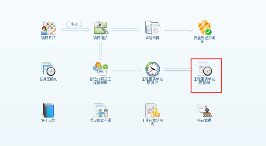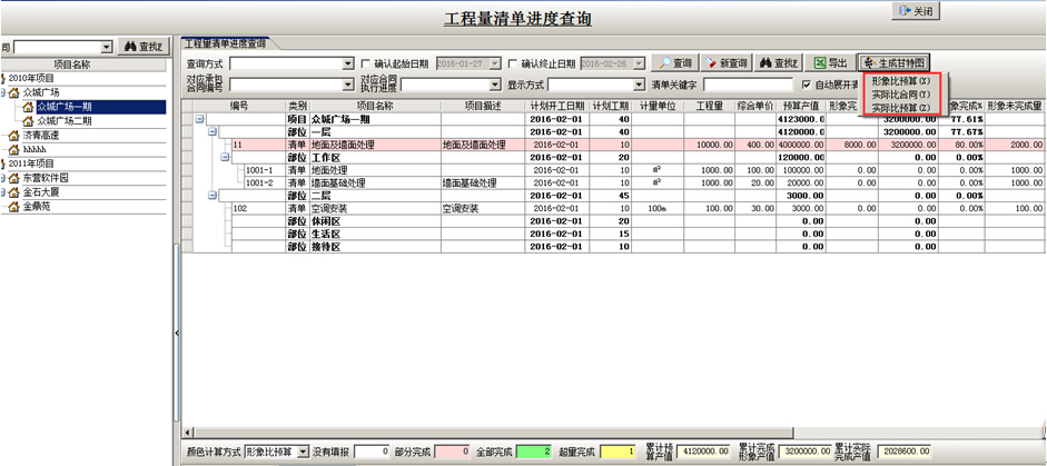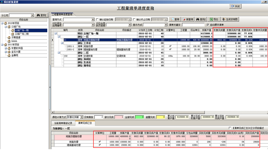 項(xiàng)目進(jìn)度查詢時(shí),系統(tǒng)會(huì)根據(jù)項(xiàng)目部分以及工程量清單匯總項(xiàng)目進(jìn)度。如圖: