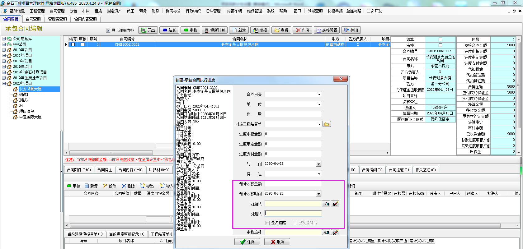 1、在【工程管理】-【承包合同】-合同執(zhí)行進度,點擊新增,填寫預計收款金額、預計收款時間、提醒人、是否提醒。