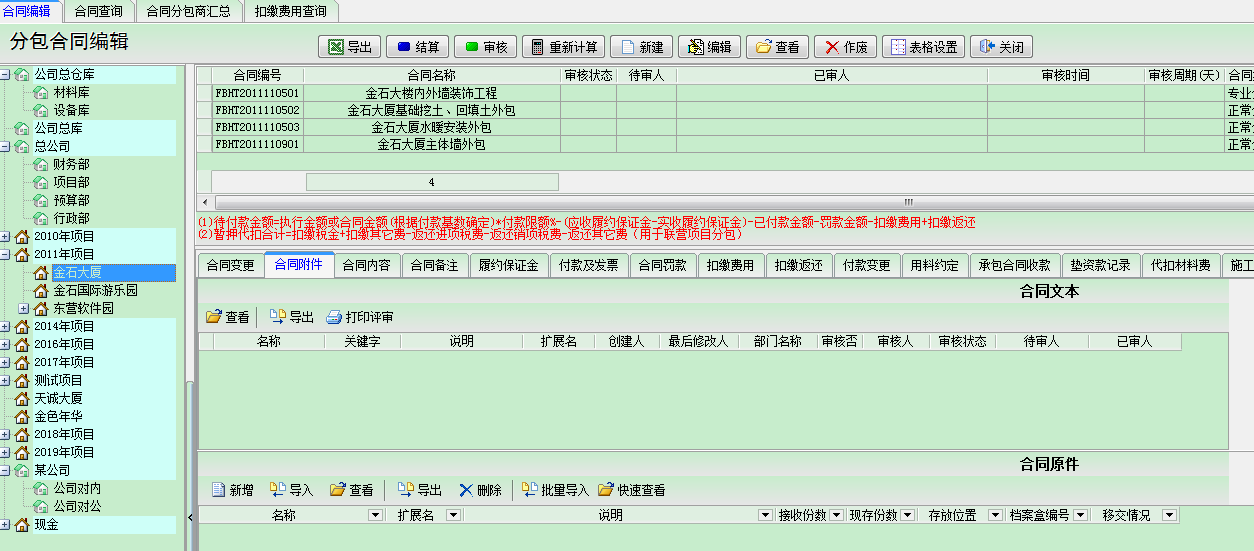在【合同編輯】中左半部分是合同的分類(lèi),分包合同也是按【項(xiàng)目維護(hù)】進(jìn)行分類(lèi)管理的。一個(gè)項(xiàng)目下可以建立多個(gè)合同,窗口的右上部分是合同列表,一行信息代表一個(gè)合同。右下部位是當(dāng)前合同相關(guān)的內(nèi)容:【合同附件】、【合同內(nèi)容】、【合同備注】、【履約保證金】、【合同提醒】、【合同付款及相關(guān)發(fā)票】、【合同罰款】、【扣繳費(fèi)用】、【合同材料約定】、【資質(zhì)管理】、【合同借閱】。