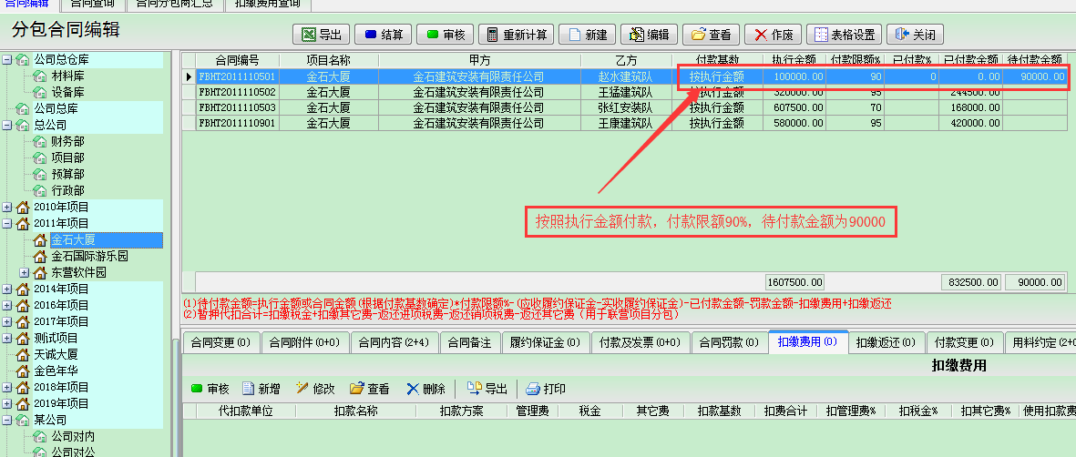 在工程項(xiàng)目管理中,工程款含甲供材費(fèi)用的情況經(jīng)常會(huì)遇到,若總包方對(duì)外分包而且分包款也是包含甲供材費(fèi)用的話(huà),同樣的在分包管理中就應(yīng)該在分包工程款中扣除相應(yīng)的甲供材費(fèi)用。或者我方給分包商提供材料。為此金石工程項(xiàng)目管理軟件中做出相應(yīng)的解決方案,以下為示例說(shuō)明