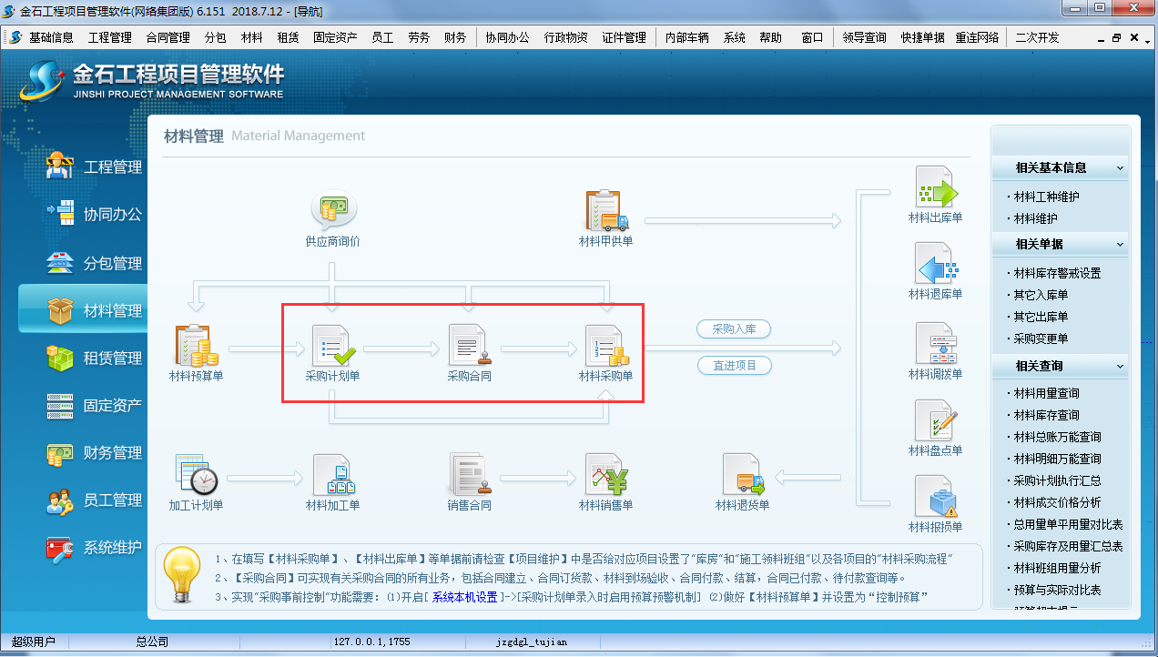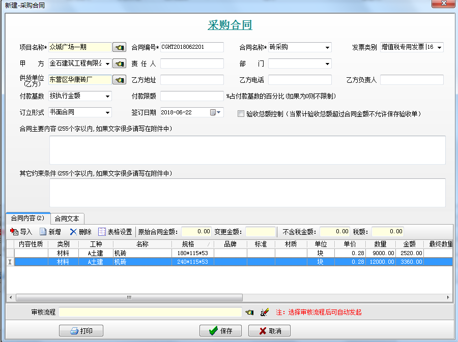 第一步,進(jìn)入工程項目管理系統(tǒng)的【材料管理】模塊,點擊[采購合同],如圖: