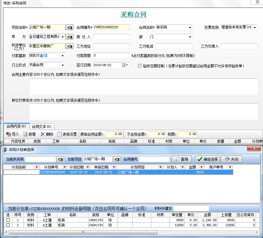 第二步,新建合同時可以從采購計劃選擇合同內(nèi)容明細(xì)。