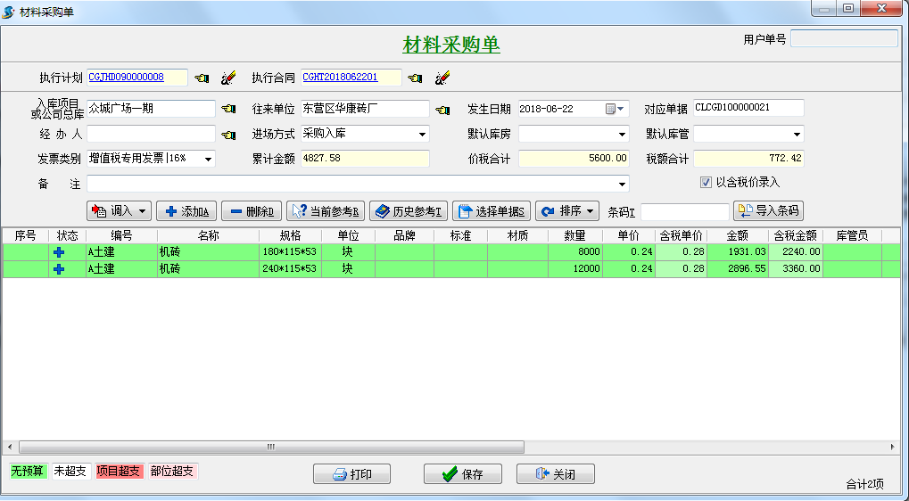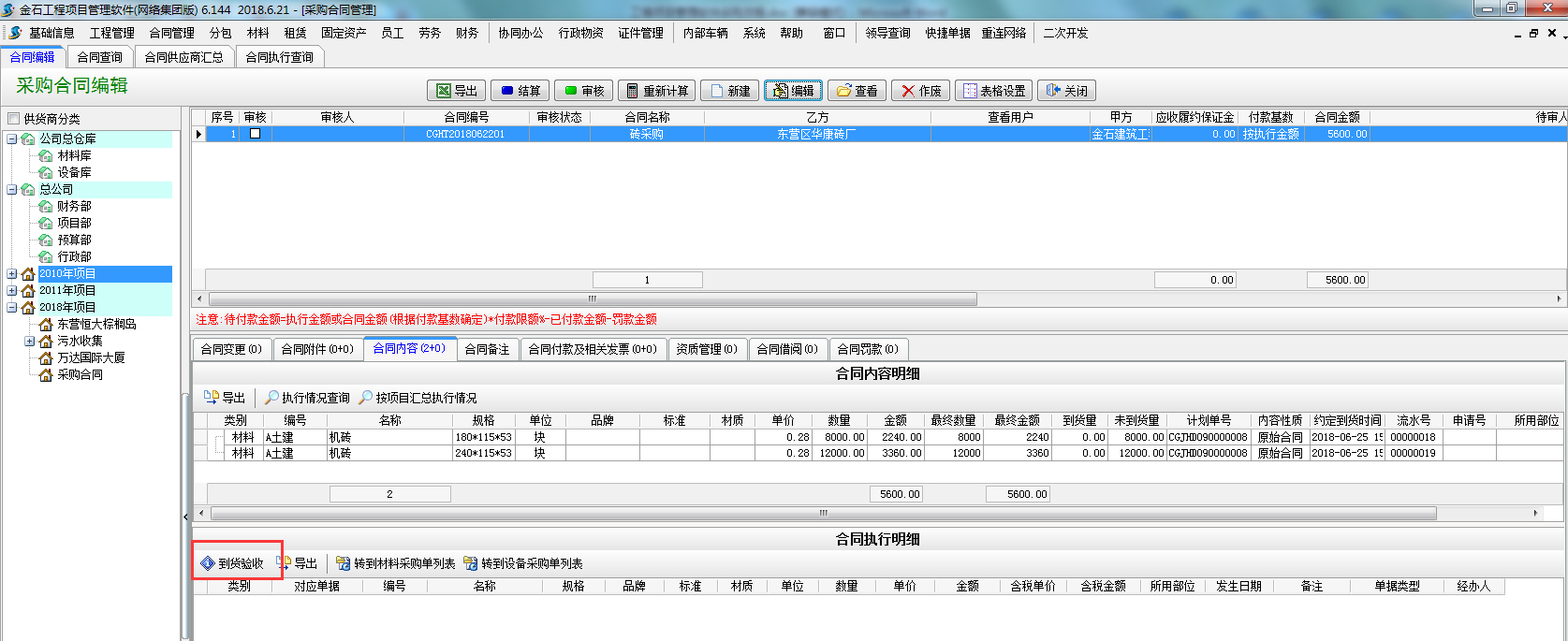 第三步,材料到貨之后,可在采購合同選擇到貨驗收或者直接新建材料采購單選擇執(zhí)行合同。