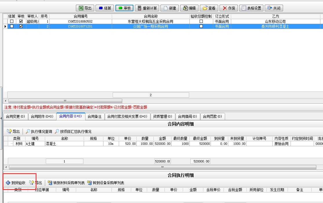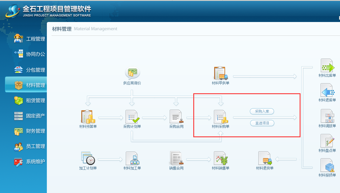 第一步,進(jìn)入工程項(xiàng)目管理系統(tǒng)的【材料管理】模塊,點(diǎn)擊[采購合同],如圖: