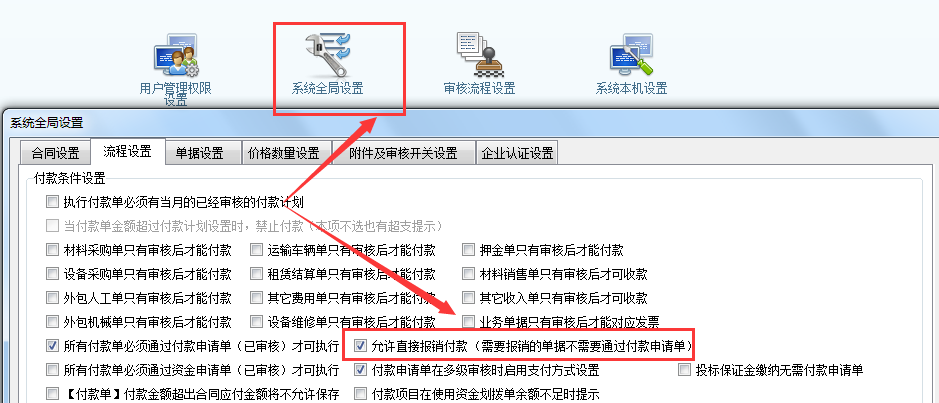 在“系統(tǒng)維護(hù)”→“系統(tǒng)全局設(shè)置” 開啟“允許直接報銷付款”