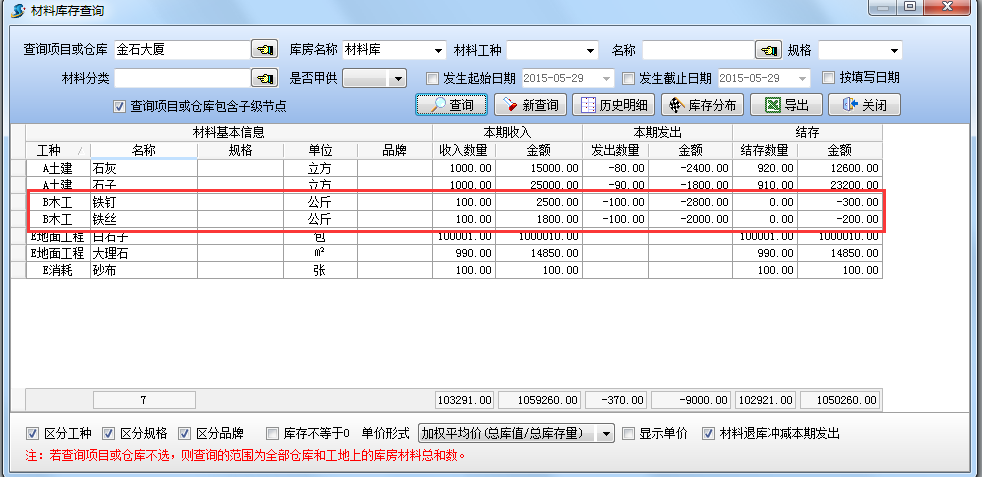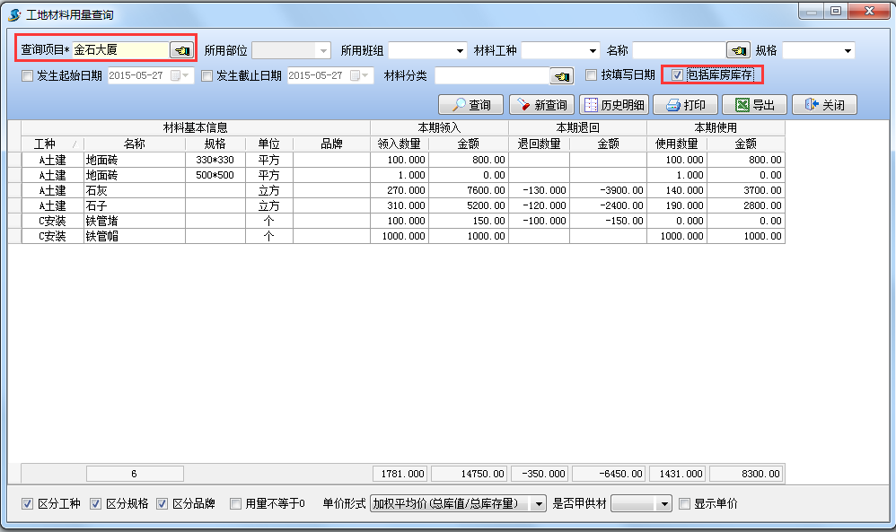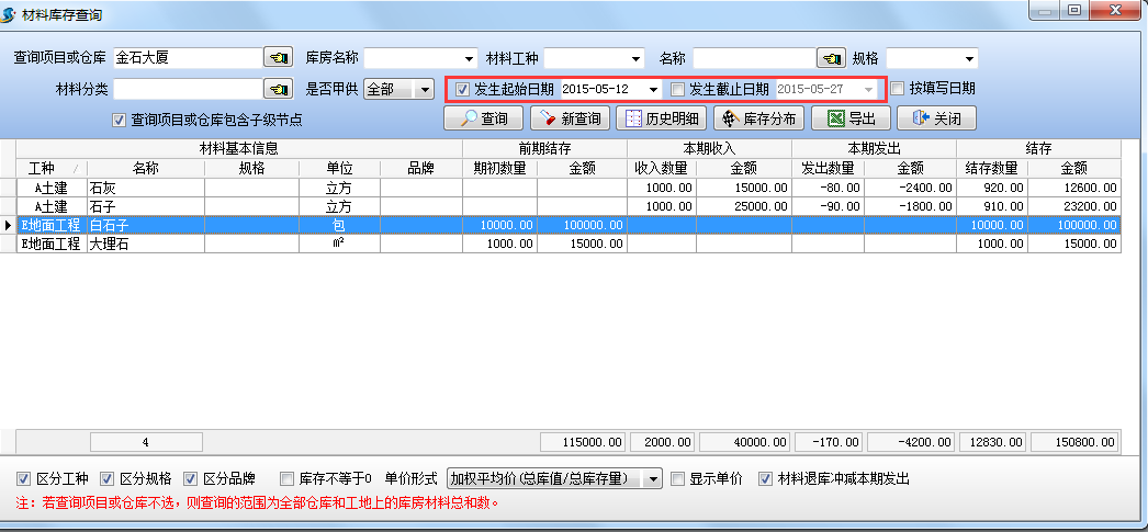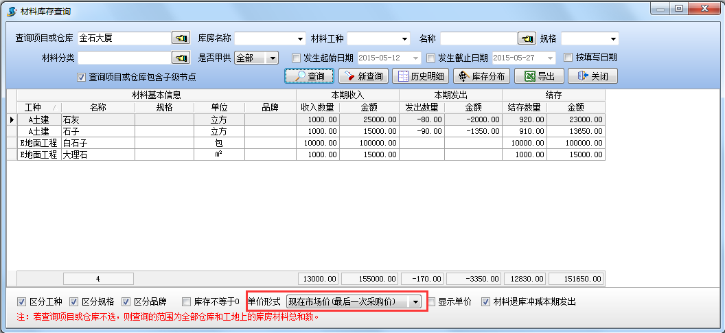 設(shè)置查詢項目為【金石大廈】,查詢結(jié)果如下圖:查詢當(dāng)前項目【金石大廈】(包括所有庫房)的材料庫存情況。