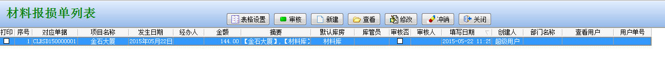 【保存】該單據(jù),返回到【材料報損單列表】窗口下,如下圖: