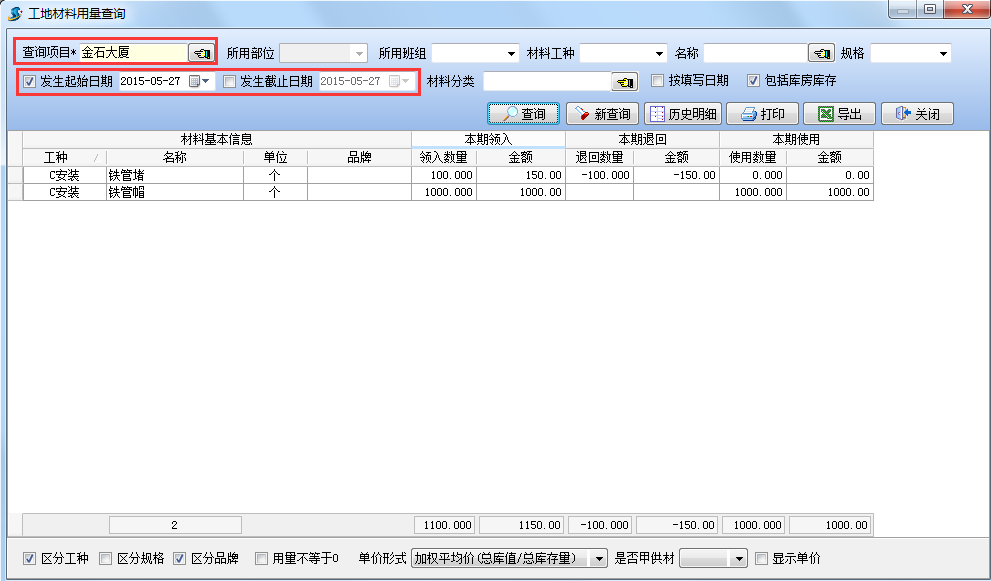 當(dāng)單價形式設(shè)置為【最后一次采購價】進(jìn)行查詢時,可以得出當(dāng)前項目材料的庫存總值,如下圖: