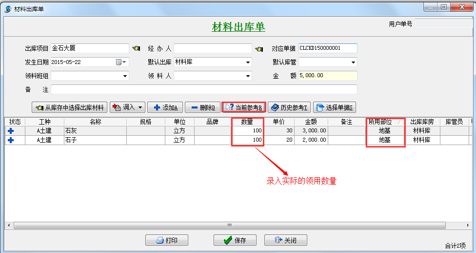 代入材料后,錄入實際的領(lǐng)用數(shù)量、所用部位,如下圖: