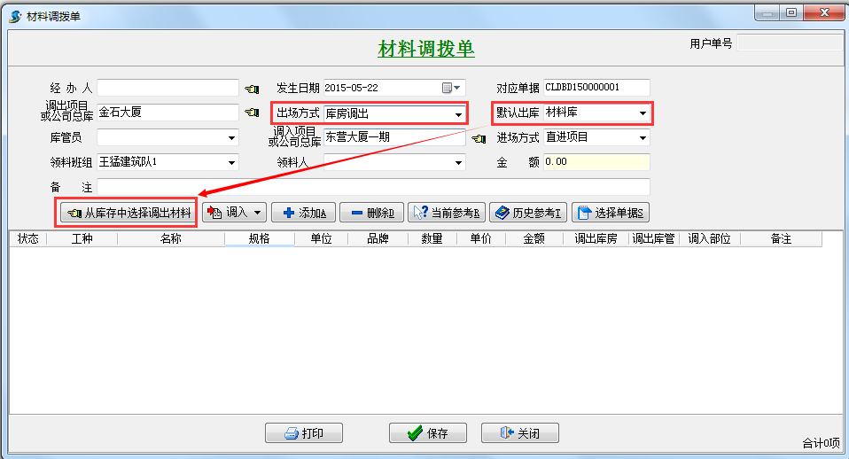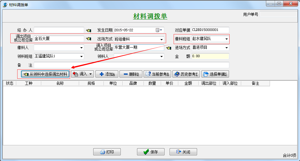 點擊主菜單【材料】->【材料調(diào)撥單】->【新建】打開界面如下: