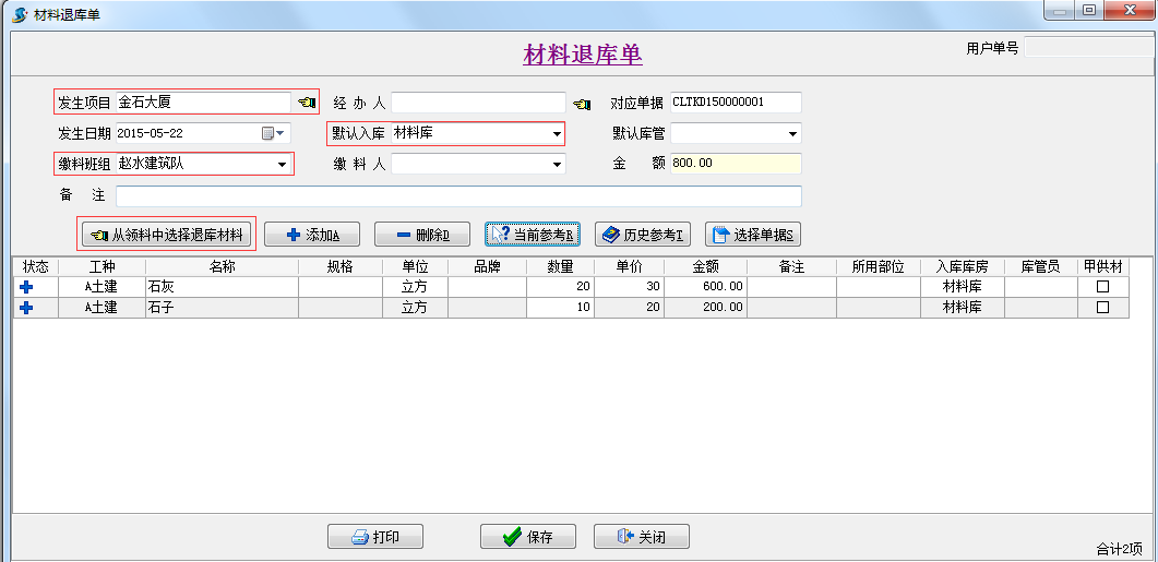 說明:該單據(jù)的功能界面類似【材料出庫單】,只不過本單據(jù)是記錄的退料的過程,具體操作可以參考【材料出庫單】。