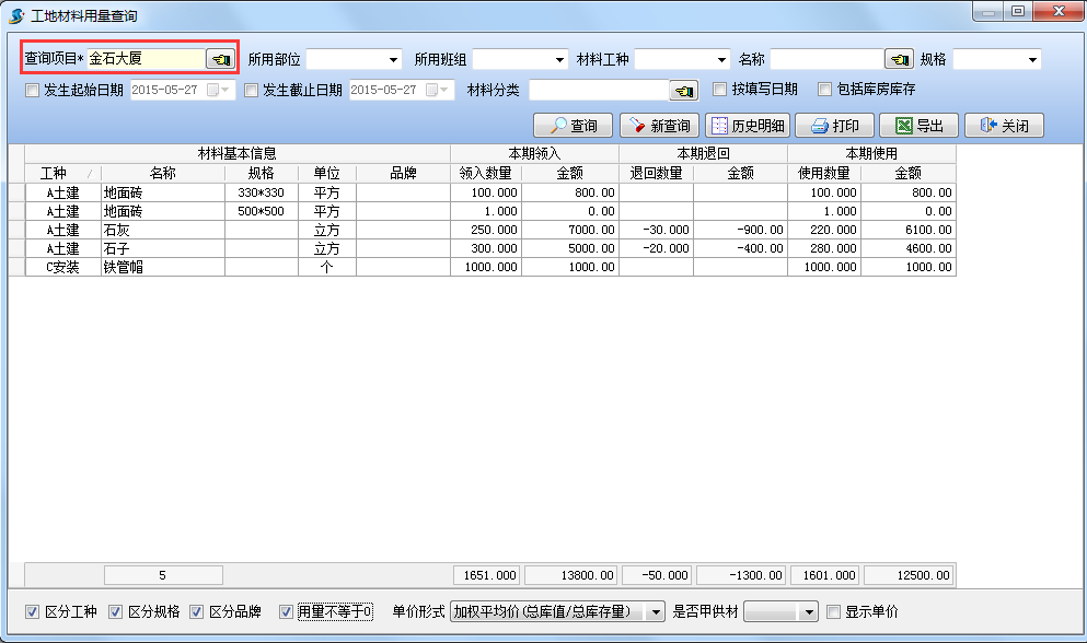 【工地材料用量查詢】是在工地現(xiàn)場材料管理中查詢工地材料用量,在查詢前需要設(shè)置查詢項目設(shè)置查詢項目為金石大廈,查詢結(jié)果如下圖: