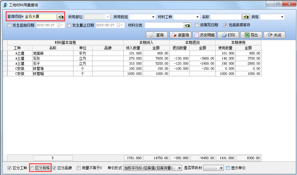 取消過濾選項"區(qū)分規(guī)格",查詢結(jié)果如下圖:相同材料不同規(guī)格的材料用量將匯總在一起。
