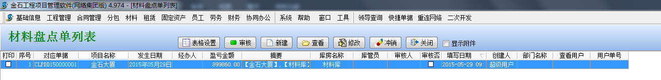 【材料盤點單】用來工地現(xiàn)場材料管理中重新盤點材料的實際庫存,當(dāng)盤點的實際庫存與軟件庫存不符時,會產(chǎn)生盤點的盈虧數(shù)量、金額。從而影響系統(tǒng)中的材料庫存。一般該功能用于初期使用軟件建立庫存、或工程竣工重新盤點庫存。錄入本單據(jù)前,需先錄入要用到【材料維護(hù)】、【項目維護(hù)】(包括【庫房信息】)。