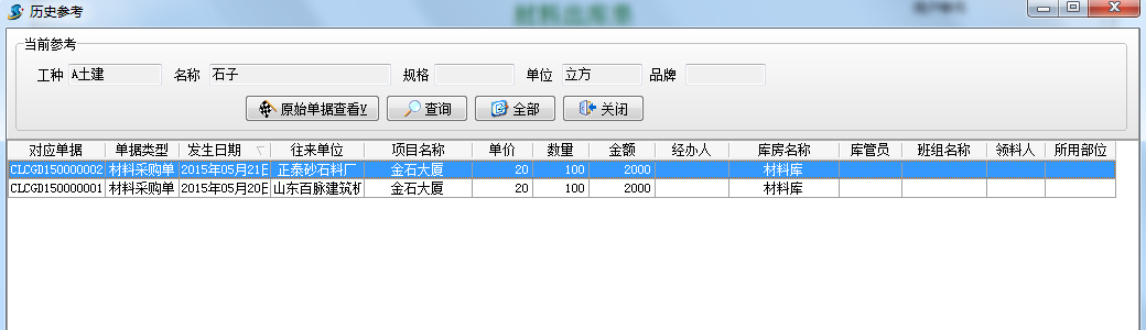 選中材料【石子】點擊【歷史參考】,可以看【石子】的歷史明細(xì)記錄,如下圖