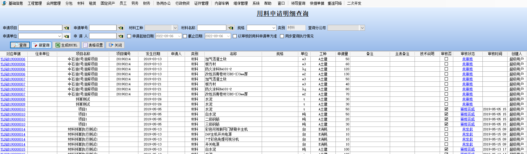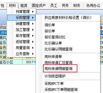 金石工程管理軟件材料管理模塊新增:用料申請明細查詢