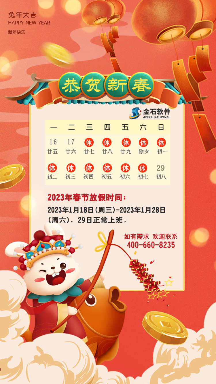 金石軟件茲定于2023年1月18日開始新春假期,1月29日日恢復(fù)營(yíng)業(yè),假期雖至,如您有需求仍可以撥打400-660-8235或您所知曉的軟件工程師電話獲取服務(wù)。