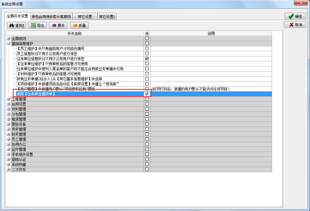 使用該功能之前需在【系統(tǒng)全局設(shè)置】中開啟‘啟用【往來單位增改單】’,開啟后可以使用往來單位增改單新增或者修改往來單位,同時往來單位維護禁止使用新增和修改功能。