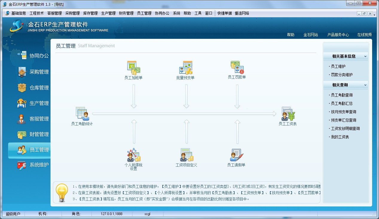 員工管理主要管理人員檔案、員工考勤、員工加班請假、員工預(yù)支、員工罰款最后生成工資表的過程。