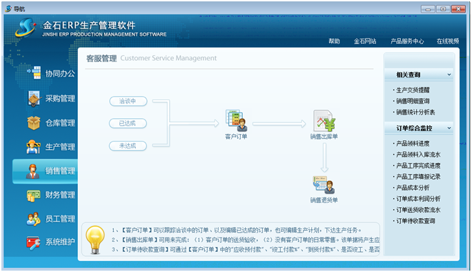 主要是完成和客戶訂單有關(guān)的工作,包括設(shè)定客戶訂單的狀態(tài)、銷售出庫、銷售退貨,對客戶銷售情況統(tǒng)計報表等。