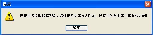 如果彈出錯(cuò)誤提示:“連接服務(wù)器數(shù)據(jù)庫失敗,請(qǐng)檢查數(shù)據(jù)庫是否附加,所使用的數(shù)據(jù)庫引擎是否匹配”