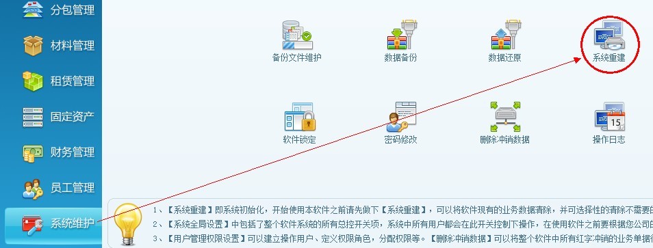 系統(tǒng)重建一般是在軟件正式使用前,清除以前測(cè)試數(shù)據(jù)庫(kù)時(shí)使用。