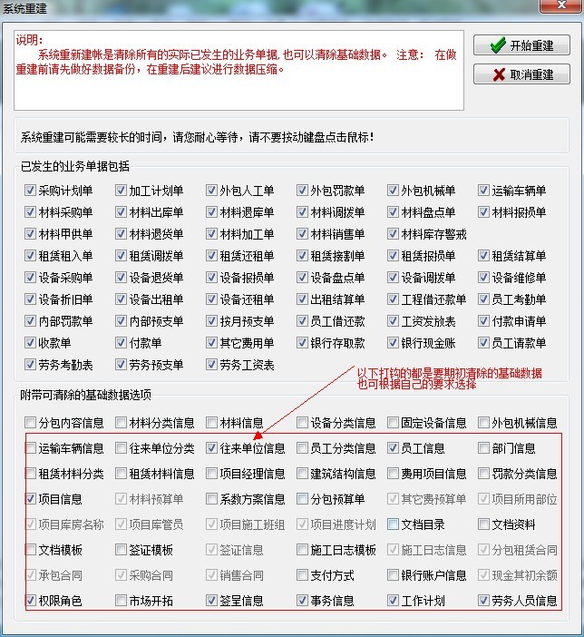 在彈出的窗口中選擇需要清除的內(nèi)容(例:業(yè)務(wù)單據(jù)、項(xiàng)目維護(hù)、材料工種等),