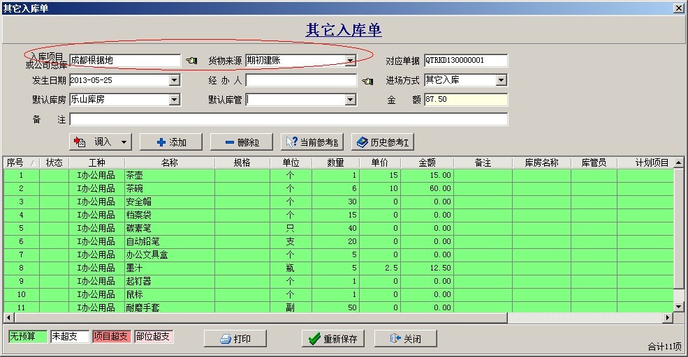 固定設(shè)備、材料庫存的實(shí)際數(shù)量應(yīng)該通過業(yè)務(wù)單據(jù)來錄入。其中固定設(shè)備通過設(shè)備收入單來錄入期初數(shù)量。如下圖: