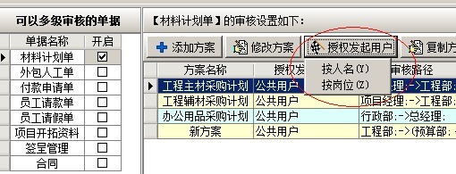 審核流程設(shè)置完成后,保存生效,然后再設(shè)置授權(quán)發(fā)起用戶,在新建審核方案的界面上,選中審核方案,點擊【授權(quán)發(fā)起用戶按鈕】。這是會彈出按人名和按崗位兩種模式,按人名授權(quán)就是在彈出的窗口中選中需要授權(quán)的用戶(其中公共用戶是指的全部用戶),按崗位授權(quán)就是在彈出的窗口中選中需要授權(quán)的崗位,統(tǒng)一崗位下所有用戶被授權(quán)。如下圖: